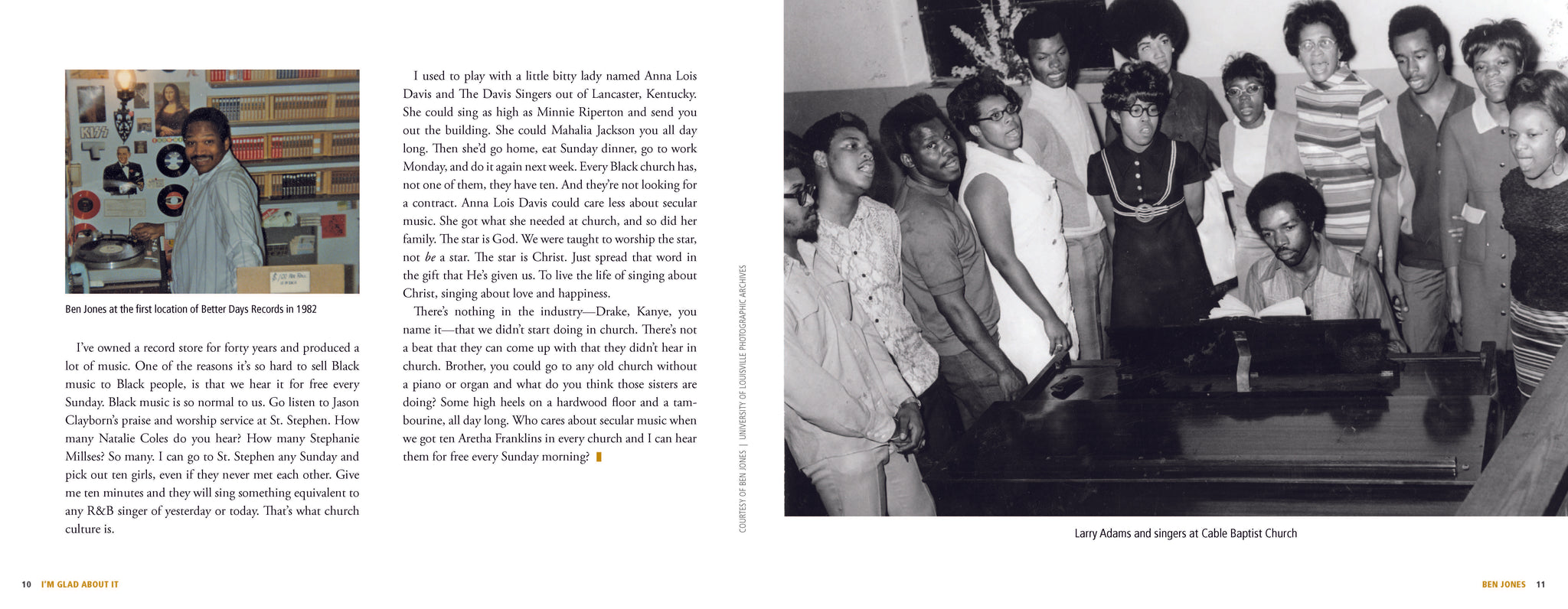 "Like all of the Louisville Story Program's work, I'm Glad About It is a vital portrait of a community presented through the eyes, ears, and mouths of its members—in this case the singers, players, producers, and facilitators of the city's fantastically rich Black gospel tradition. Its impact and import, though, should be felt far beyond Louisville. This is community archiving at its absolute best, from methodology to music."